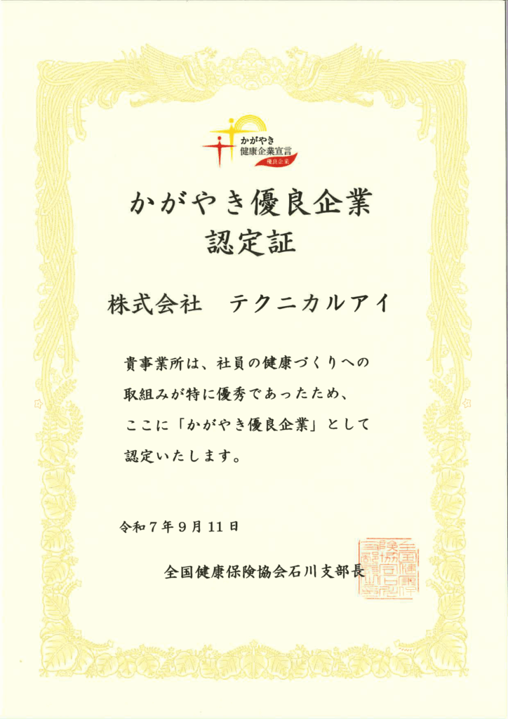 このたび、当社は「かがやき優良企業」に認定され、認定証をいただきました。